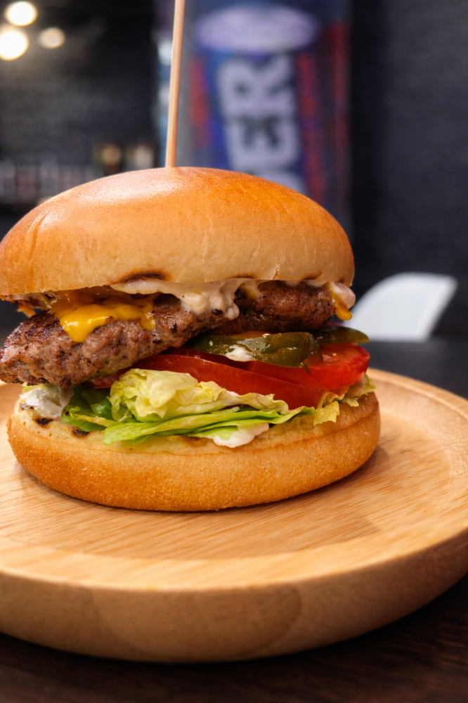 - Свино-Говяжья Котлета 200гр- Фирменный Соус- Больше Сыра- Лист Салата- Помидоры- Маринованные Огурцы- Маринованный Красный Лук
